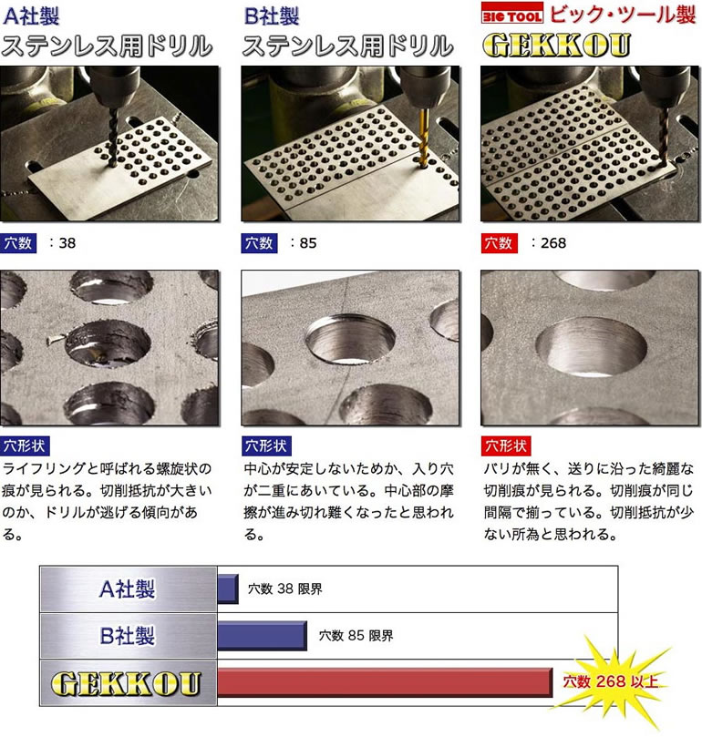GEKKOUは、分厚いステンレス板を⌀10mmドリルで、簡単に穴をあけてしまいます。しかもエアードリルを使って、乾式で穴あけしておりますので、オイルを嫌う作業現場で最適な性能を発揮することができます。(切削油がなくても切れますが、切削油があればなお良く切れ、また耐久性の向上に繋がります。)